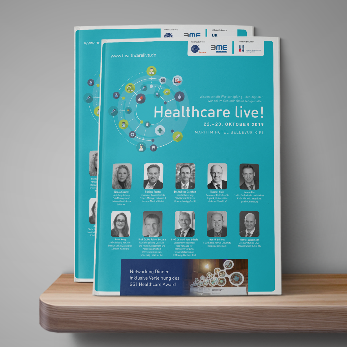 Für unseren Kunden GS1 Germany realisieren wir seit einigen Jahren Programmflyer zu unterschiedlichen, themenspezifischen Seminaren, Workshops und Konferenzen. Die Herausforderung bei der Printfassung ist sehr umfangreich. Viele Informationen müssen möglichst übersichtlich, ansprechend und verständlich dargestellt werden, gleichzeitig muss die Struktur so gewählt werden, dass kurzfristige Änderungen schnell realisierbar sind. Wenn zwei Stunden vor Drucklegung noch ein Referent wechselt oder sich ein Programmpunkt ändert, muss das blitzschnell aktualisierbar sein. Neben der Online-Bewerbung ist der gedruckte Programmflyer, der als Selfmailer versandt wird, das wichtigste Bewerbungstool für die GS1 Germany Weiterbildungsformate.